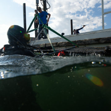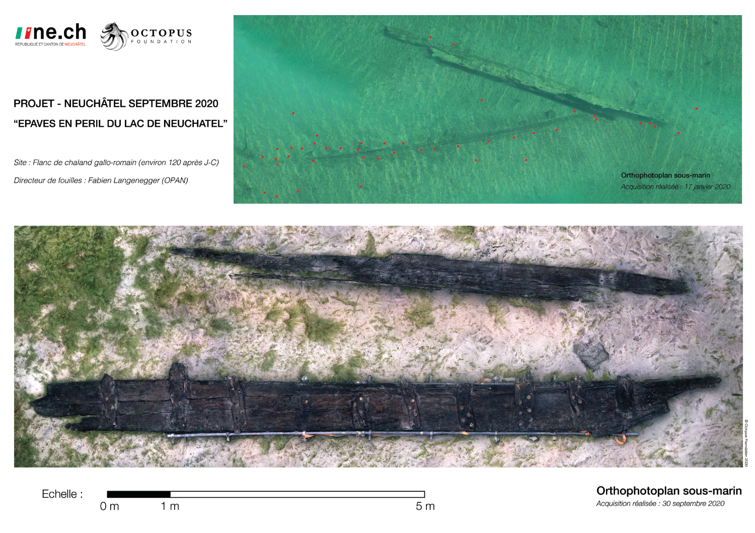 En novembre 2018, une mission de repérages a réuni Fabien Langenegger et l’équipe de plongée de la Fondation Octopus pour collecter toutes les données nécessaires à la préparation du projet. Lors de cette courte mission de trois jours, il a aussi été possible de plonger sur l’épave du Quai Osterwald à Neuchâtel. Ce navire, qui a sombré en 1853, mesure 30 mètres de long et repose à huit mètres de profondeur. En une plongée, l’équipe a pu déployer le balisage sous-marin et faire une acquisition photogrammétrique de près de 600 photos. Le modèle 3D de cette magnifique épave est visible ici.